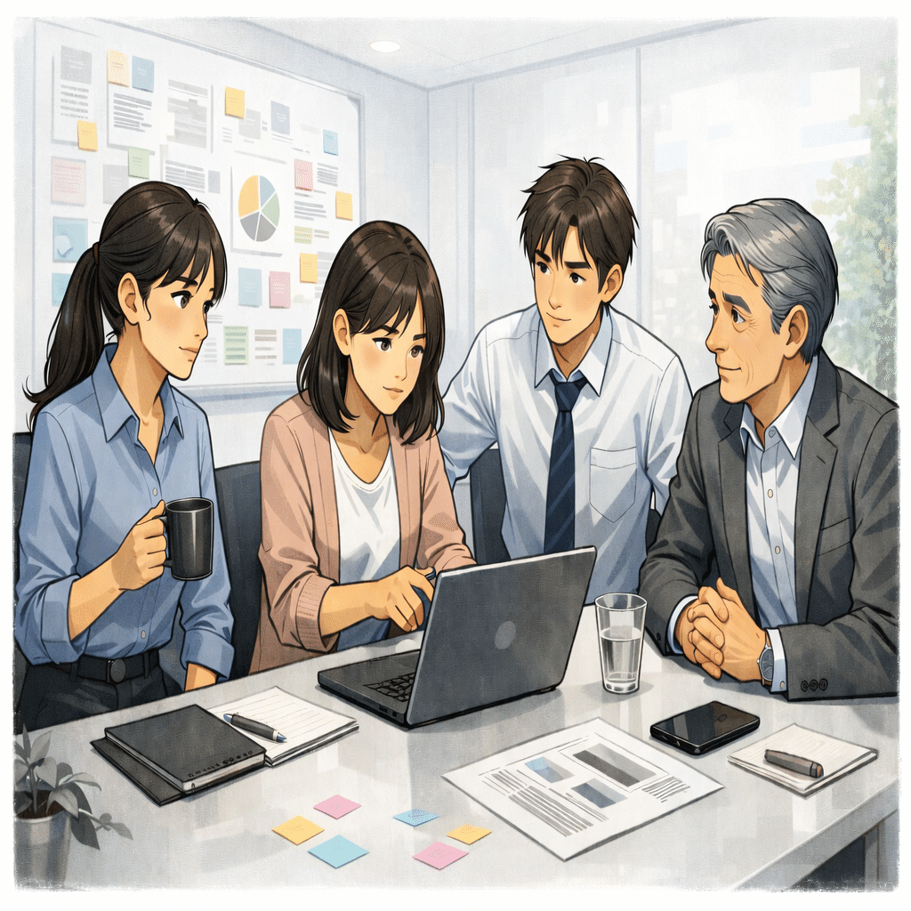 会議室に、重たい沈黙が流れる。視線を落とす若手社員。PCの画面を見続ける者、ノートを見つめる者。誰も口を開かない。