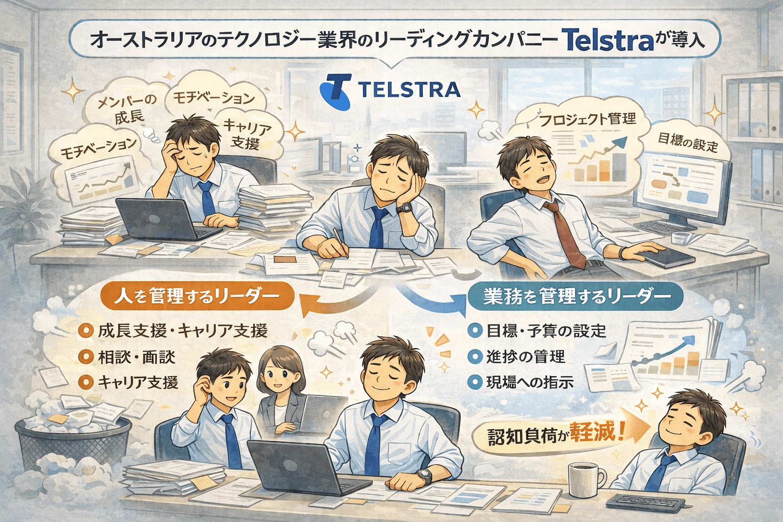 オーストラリアの伝統を誇る通信・テクノロジーのリーディングカンパニーであるテルストラは、これまで一人の管理職が担っていた仕事を、「人を管理するリーダー」と「業務を管理するリーダー」の2つに分離する施策を導入しました。